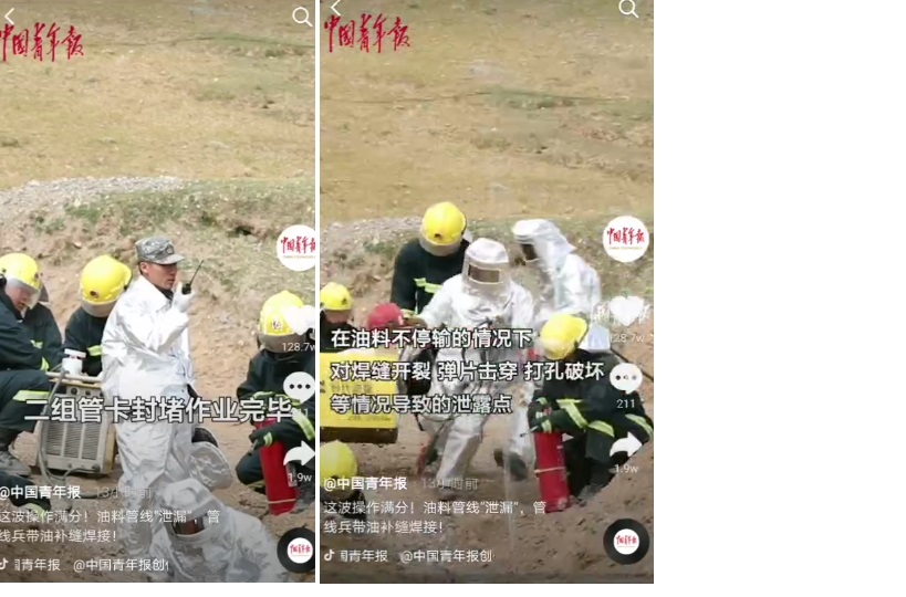 據(jù)《中國青年報》報道,9月19日西藏軍區(qū)青藏兵站某管線大隊組織實戰(zhàn)化輸油管線鋪設(shè)搶修演練。在油料不停輸情況下對焊縫開裂,單片穿孔,打孔破壞等情況導(dǎo)致的泄露點,官兵們采用補片焊接,管卡封堵,帶油焊接的方式對管線漏點組織搶修。