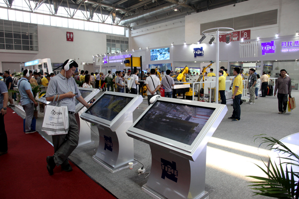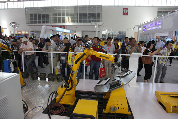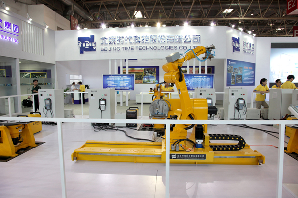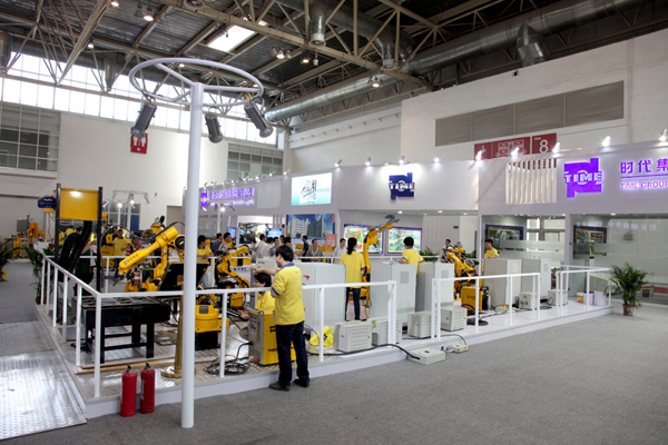 從展示內容看,時代展臺分為三大部分:自動焊設備展示區,焊接電源展示區,焊接機器人展示區。今年時代公司展示的6套機器人產品全部都是自己研發和制造的,這是一次時代自產機器人產品的集中亮相,引起了業內和觀眾的極大關注。時代機器人配合時代自制的高精度變位機系統在展臺上表演了復雜焊縫的焊接及復雜圖形的切割,焊縫外形美觀精致,切割尺寸精準,切口光滑美觀。大批的觀眾舉著焊帽圍攏在演示臺附近悉心觀賞時代機器人焊接與切割的全過程。4套機器人在時代自產操作系統的指揮下與變位機導軌相配合表演了搬運工件、焊接裝配工件的全過程,演示動作準確穩定。
