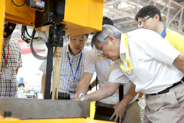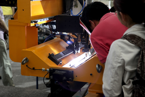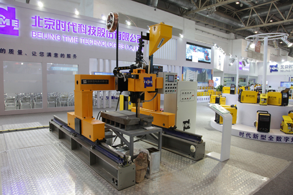 自動焊設備展示區中最突出,最吸引觀眾的是單絲窄間隙焊機和超高頻方波焊機。它們是時代在原有成熟技術的基礎上研制的升華型產品,TDW5000E超高頻脈沖方波氬弧焊機采用超高頻脈沖信號控制,實現了過零無死區時間且具有超快速電流上升/下降沿變化速率及0~100kHz脈沖頻率的達百安培的方波電流輸出。比常規的普通方波焊機相比焊接過程控制更加可靠、精準。該機配合自動縫焊機進行現場演示。為了做好窄間隙焊機的演示,公司特制了專業的龍門式焊接輔機,窄間隙焊接過程順暢穩定,不少專家、學者和行業領導都來時代展臺觀看時代窄間隙焊接表演,并詳細詢問了設備的工藝性能和操作細節。