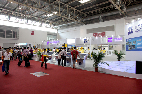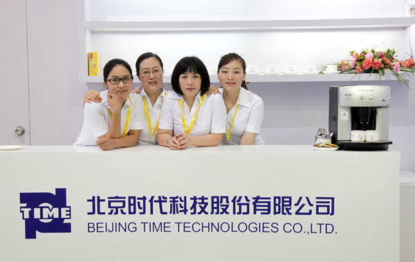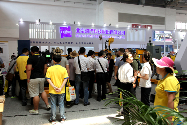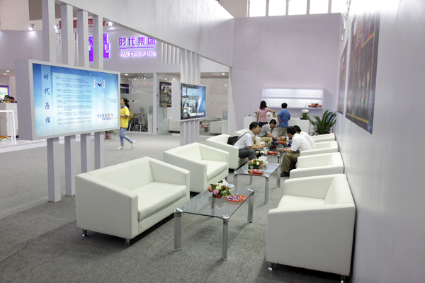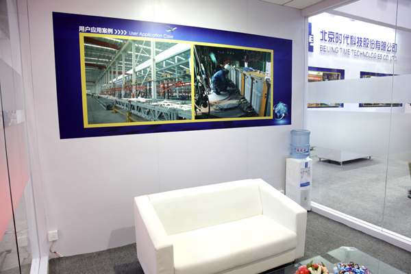 北京時代科技股份有限公司是業內展臺面積最大的參展商,展臺總可利用面積達到1008平米。公司的展位位于展覽中心的E2館。展位號:E2602。時代展臺風格恢弘大氣、通透開闊,這也是時代一貫的風格和氣魄。展臺色調以白色為主輔以藍色的燈箱字和有機字做點綴。今年時代的展臺中間橫跨一條6米寬的主通道,把展區分成左右兩邊。通道的上端制作了跨接結構上面高懸著時代公司碩大的LOGO。醒目的標志使觀眾站在E2館很遠的地方就能看到時代展臺。