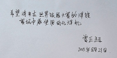從第41屆世界技能大賽開始,焊接項目的培訓(xùn)和選拔賽一直使用北京時代的電焊機。“時代焊機,中國品牌”,“時代焊機,國賽用機”,歷屆大賽選手對時代焊機非常熟悉,對時代產(chǎn)品具有特殊的感情。在第43屆世界技能大賽巴西比賽現(xiàn)場,舉辦方選用的是美國林肯焊機。曾正超和周樹春教練結(jié)合比賽期間的現(xiàn)場感受,和時代團隊溝通了時代焊機和國外品牌產(chǎn)品的性能對比和差異,對代表中國品牌的時代焊機的發(fā)展提出期望,世界冠軍曾正超親筆題寫:“希望將來在世界技能大賽的焊接賽場中能使用時代焊機”。